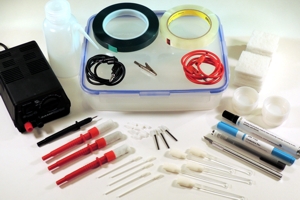 Here’s the perfect kit for replating solder-contaminated or damaged gold edge contacts. The kit includes a DC power supply and all the tools, materials, and plating solutions needed for gold-edge contact plating.